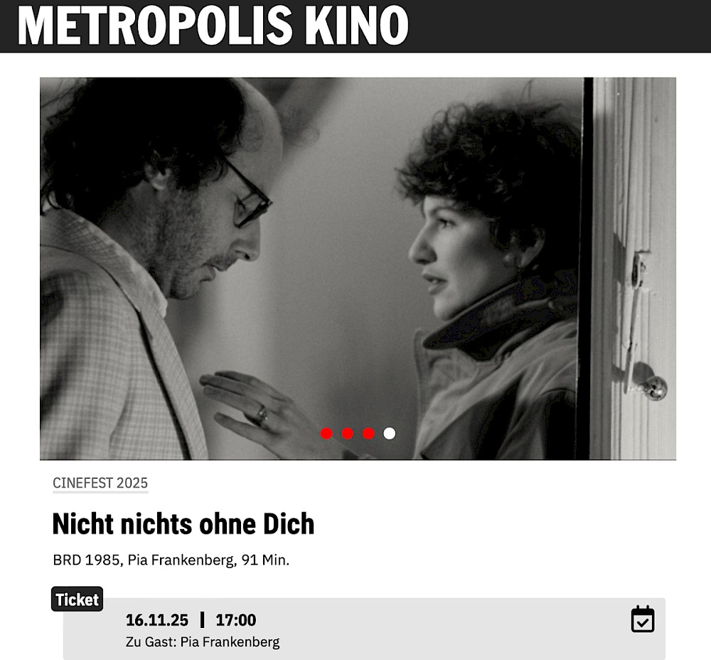 Im Rahmen des cinefest 2025 Internationales Festival des deutschen Filmerbes zeigt das Metropolis Kino in Hamburg „Nicht nichts ohne Dich“. Pia Frankenberg wird als Gast anwesend sein.